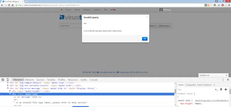 CyberInt’s offensive team recently identified a reflected cross-site scripting vulnerability within VirusTotal’s intelligence search component. VirusTotal allows organizations to use various search queries; however, if a search query is filled with a mismatched value, an error code pops up. For example, when we tried to launch a search for “type: Test” the application said there is no such search query and returned the error code below.